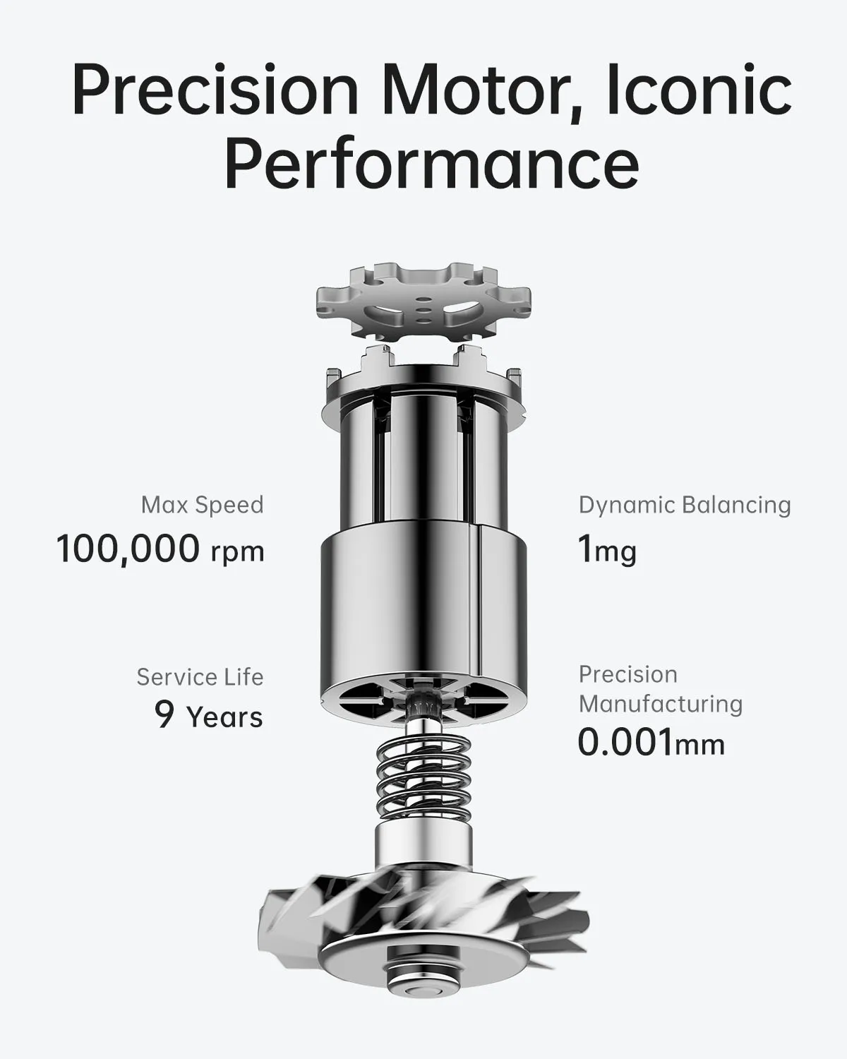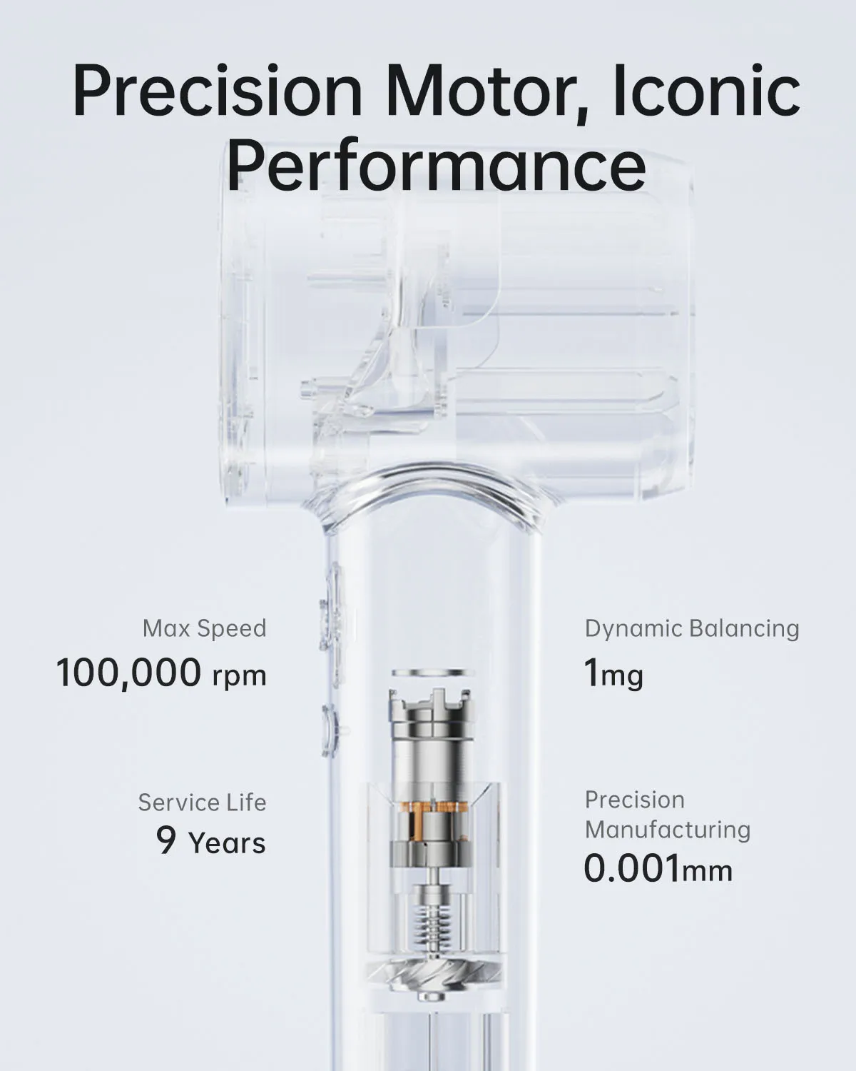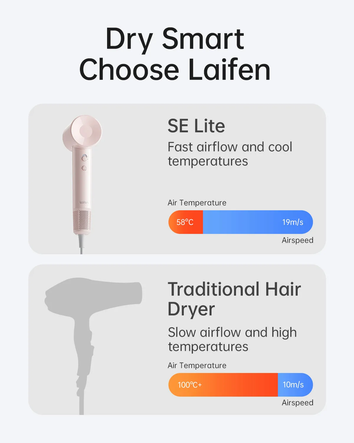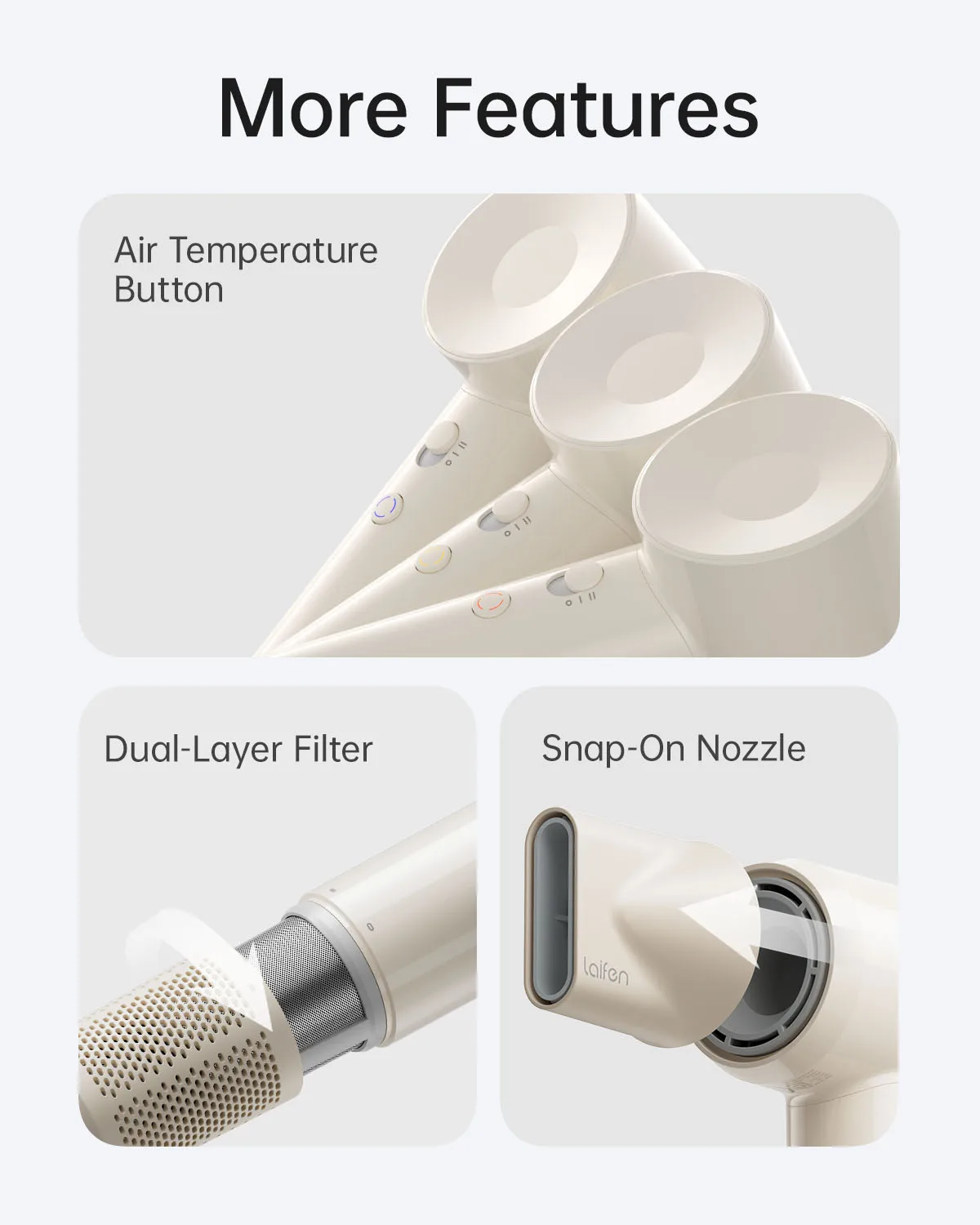 Buttons: On/Off, blow speed settings, blow temperature settings (hot, warm or cold air, cycle after holding)